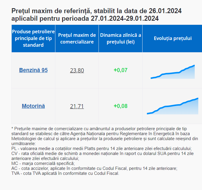 Astfel, prețul unui litru de benzină A95 nu trebuie să depășească 23,80 lei, iar cel pentru un litru de motorină - 21,71 lei.
