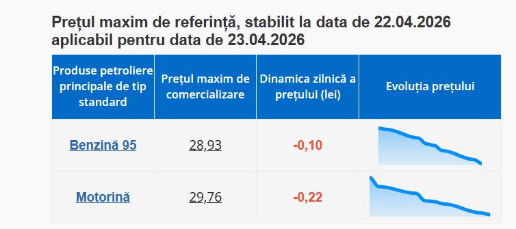 Prețul motorinei și al benzinei continuă să scadă. Agenția Națională pentru Reglementare în Energetică a publicat noile prețuri plafon la carburanți valabile pentru joi, 23 aprilie.