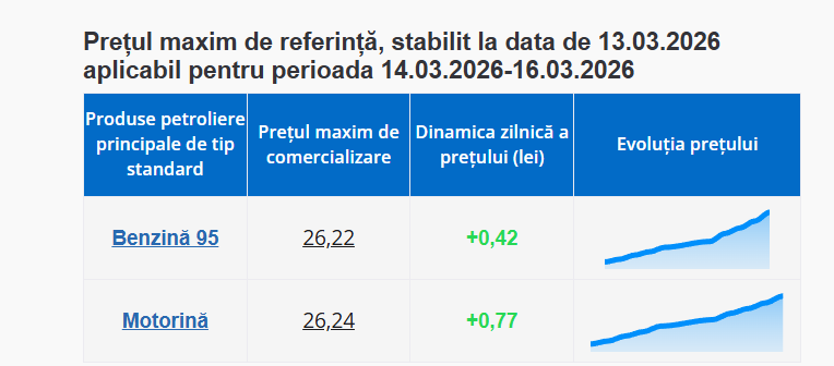 Noi scumpiri la benzinării începând din acest weekend. Motorina standard se scumpește cu încă 77 de bani. Agenția Națională pentru Reglementare Energetică (ANRE) a anunțat un preț maxim de 26,24 lei pentru un litru. Benzina cu cifra octanică 95 se scumpește şi ea cu 42 de bani pe litru și va costa la pompă cel mult 26,22 lei.