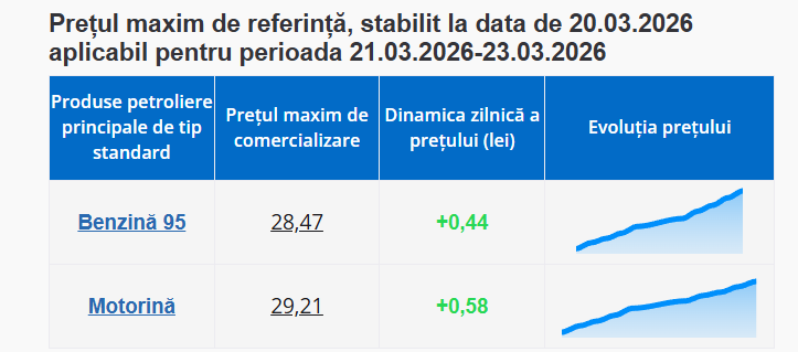 Potrivit ANRE, motorina va înregistra o majorare de 0,58 de bani, stabilindu-se la 29,21 lei pentru un litru, iar benzina va crește cu 0,44 de bani, ajungând la 28,47 lei pentru un litru.