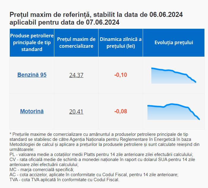 Benzina urmează a fi comercializată cu prețul de 24,37 lei/litru. Motorina va costa la pompe maximum 20,41 lei/litru.