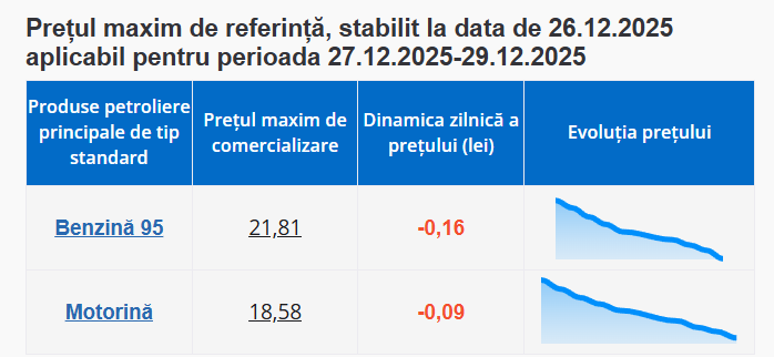 Benzina urmează a fi comercializată cu prețul de 21,80 lei pentru un litru, iar motorina va costa maximum 18,58 lei pentru un litru.