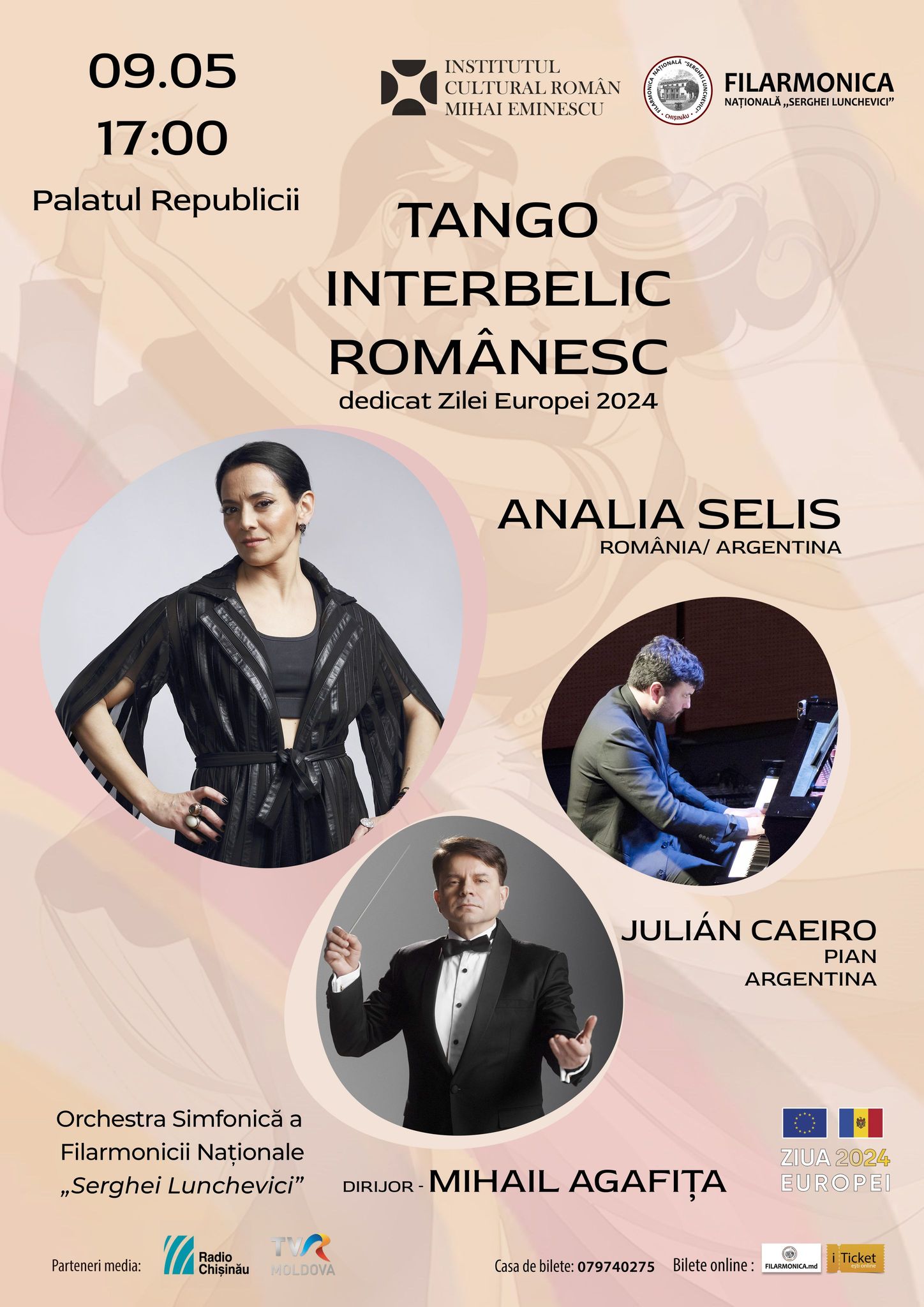 Institutul Cultural Român „Mihai eminescu” la Chișinău în colaborare cu Filarmonica Națională „Serghei Lunchevici” organizează, pe data de 9 mai 2024, la ora 17.00, concertul „Tango Interbelic Românesc”, de Ziua Europei. Evenimentul va avea loc la Palatul Republicii din Chișinău și o va avea drept protagonistă pe cunoscuta interpretă de origine argentiniană Analia Selis, acompaniată de Orchestra Simfonică a Filarmonicii Naționale „Serghei Lunchevici” sub bagheta maestrului Mihail Agafița. În completarea programului, și pentru o notă inedită, cantautorul Adrian Graur va interpreta două tangouri interbelice la chitară și voce.