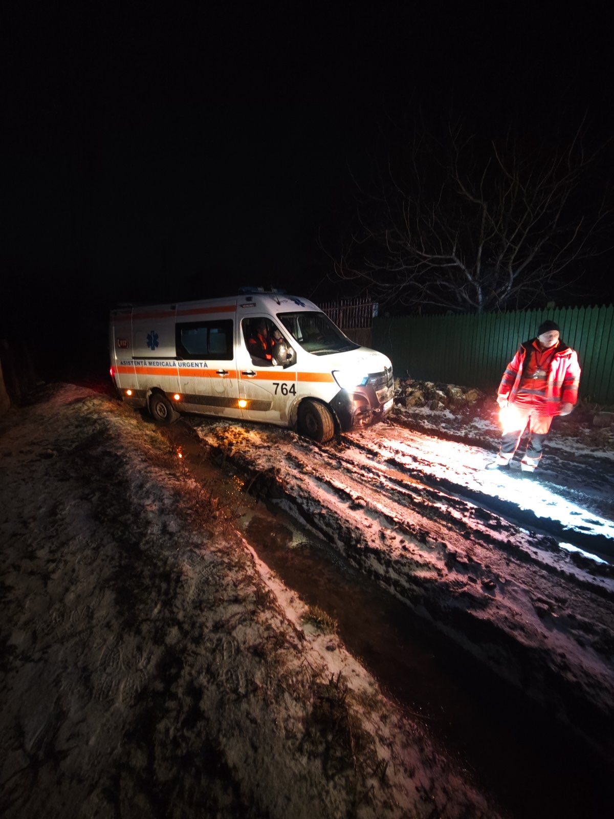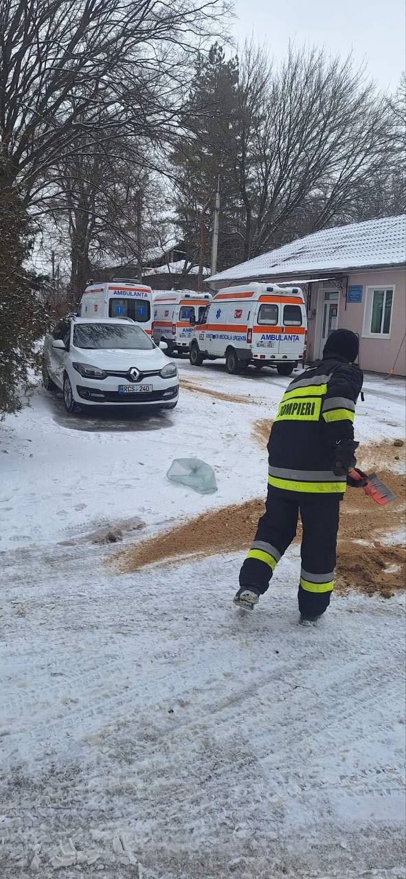 Salvatorii și pompierii au intervenit pentru deblocarea și tractarea mijloacelor de transport, inclusiv a ambulanțelor rămase blocate sau derapate de pe carosabil.