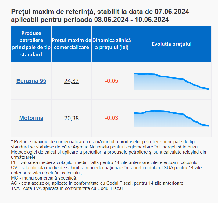 Astfel, prețul unui litru de benzină A95 nu trebuie să depășească 24,32 lei, iar cel pentru un litru de motorină - 20,38 lei.