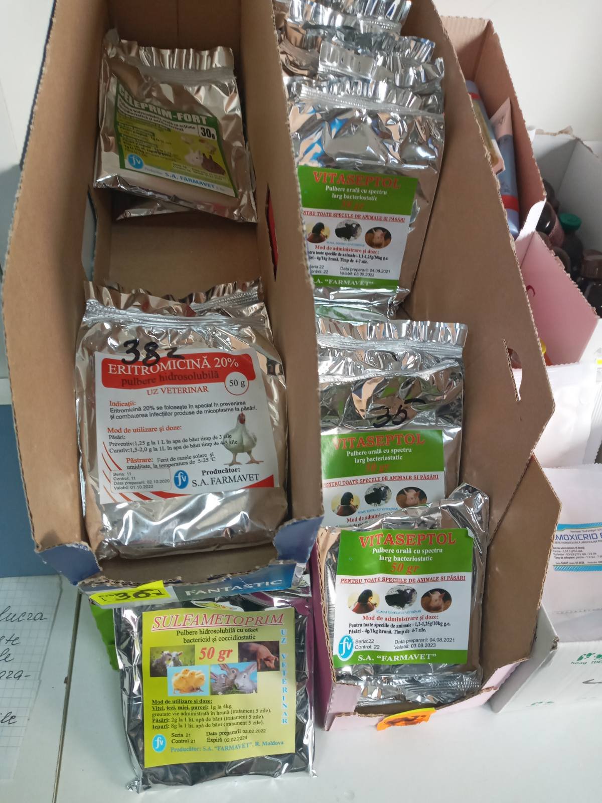 4) fabricate de SRL Farmavet: Amprovit, Tilovetoprim, Vitaseptol, Cocciprim, Eritromicină 10%, Celeprim C, Eritromicin 20%, Sulfametoprim;