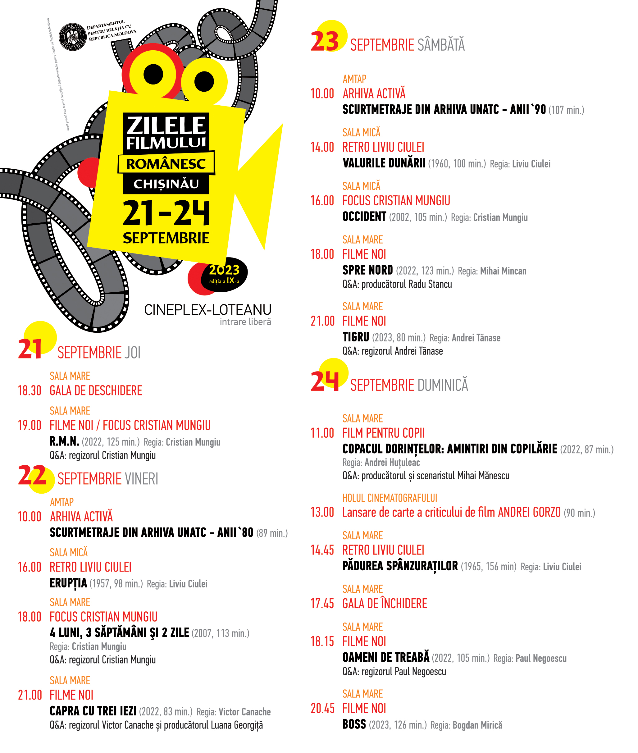 Respectând tradiția ultimilor ani, Zilele Filmului Românesc va avea o ediție complexă la Chișinău, în perioada 21-24 septembrie 2023, care va include secțiunile consacrate ale festivalului: