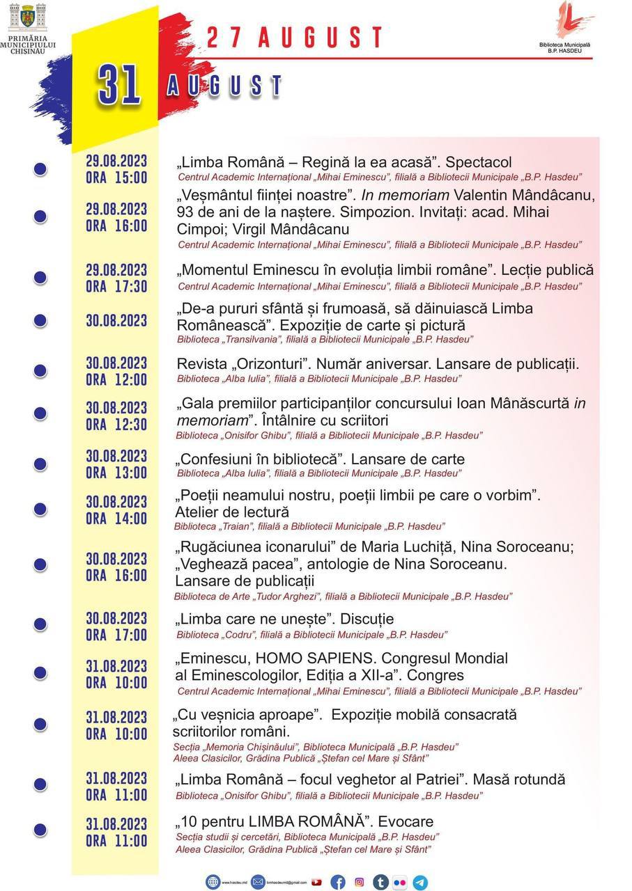 Sărbătorile vor fi marcate în filialele Bibliotecii Municipale „B.P. Hasdeu” printr-un șir de manifestări cultural - artistice precum: lecții publice, simpozioane, recitaluri de poezie, mese rotunde, dezbateri, întâlniri cu scriitori, lansări de carte, etc.