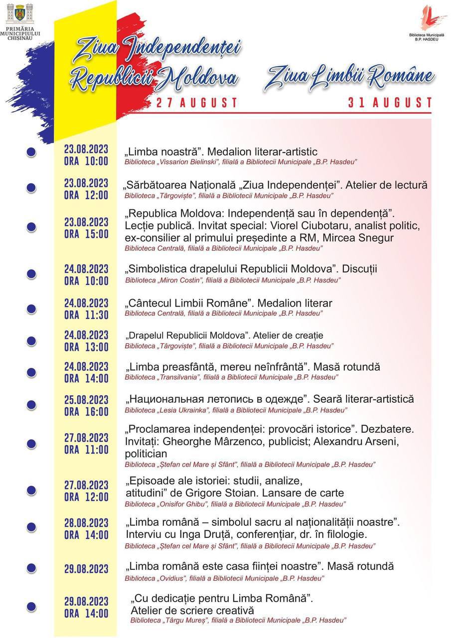Biblioteca municipală „B.P. Hasdeu” a pregătit un șir de evenimente dedicate Zilei Independenței Republicii Moldova și Zilei Limbii Române, sărbătorite anual la sfârșitul lunii august.