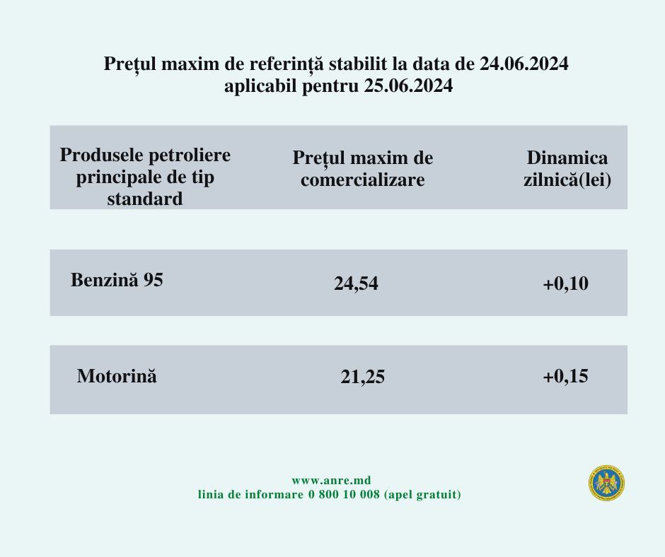 Agenţia Naţională pentru Reglementare în Energetică a stabilit preţuri noi la carburanţi pentru marți, 25 iunie.