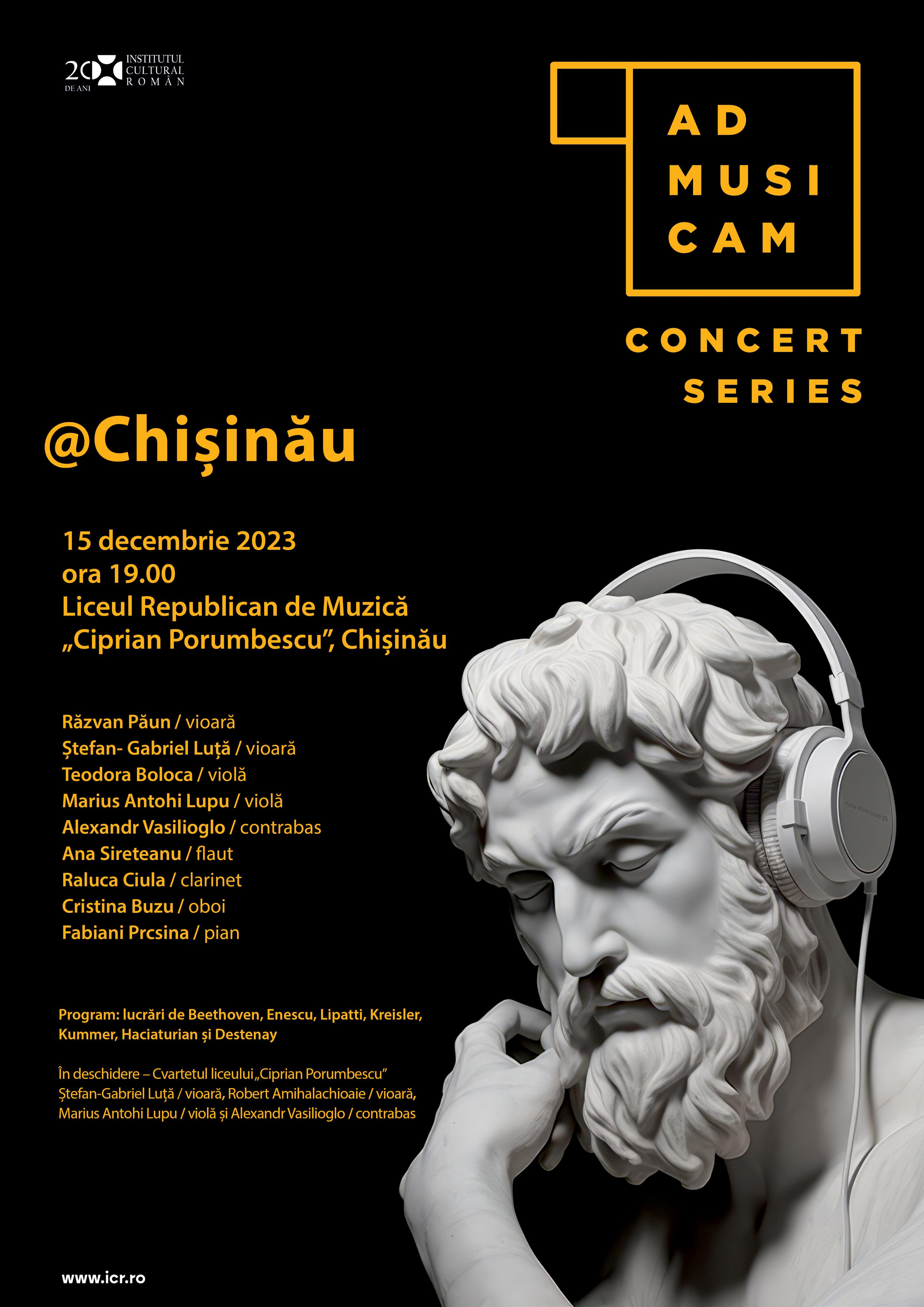 AdMusicam Concert Series este o componentă a programului ICR de instruire #AdMusicam, adresat muzicienilor cu vârste între 16 și 25 de ani și organizat de Institutul Cultural Român, în acest an, la Centrul Cultural Palatele Brâncoveneşti de la Mogoşoaia, în perioada 26 iunie – 9 iulie 2023. Tinerii absolvenți ai programului susțin pe parcursul acestui an, un concert la Chișinău și șase concerte în mai multe locuri din București.