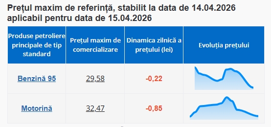 Astfel, benzina se ieftinește cu 0,22 lei și va costa 29,58 lei per litru, în timp ce motorina înregistrează o scădere de 0,85 lei, ajungând la prețul de 32,47 lei per litru.