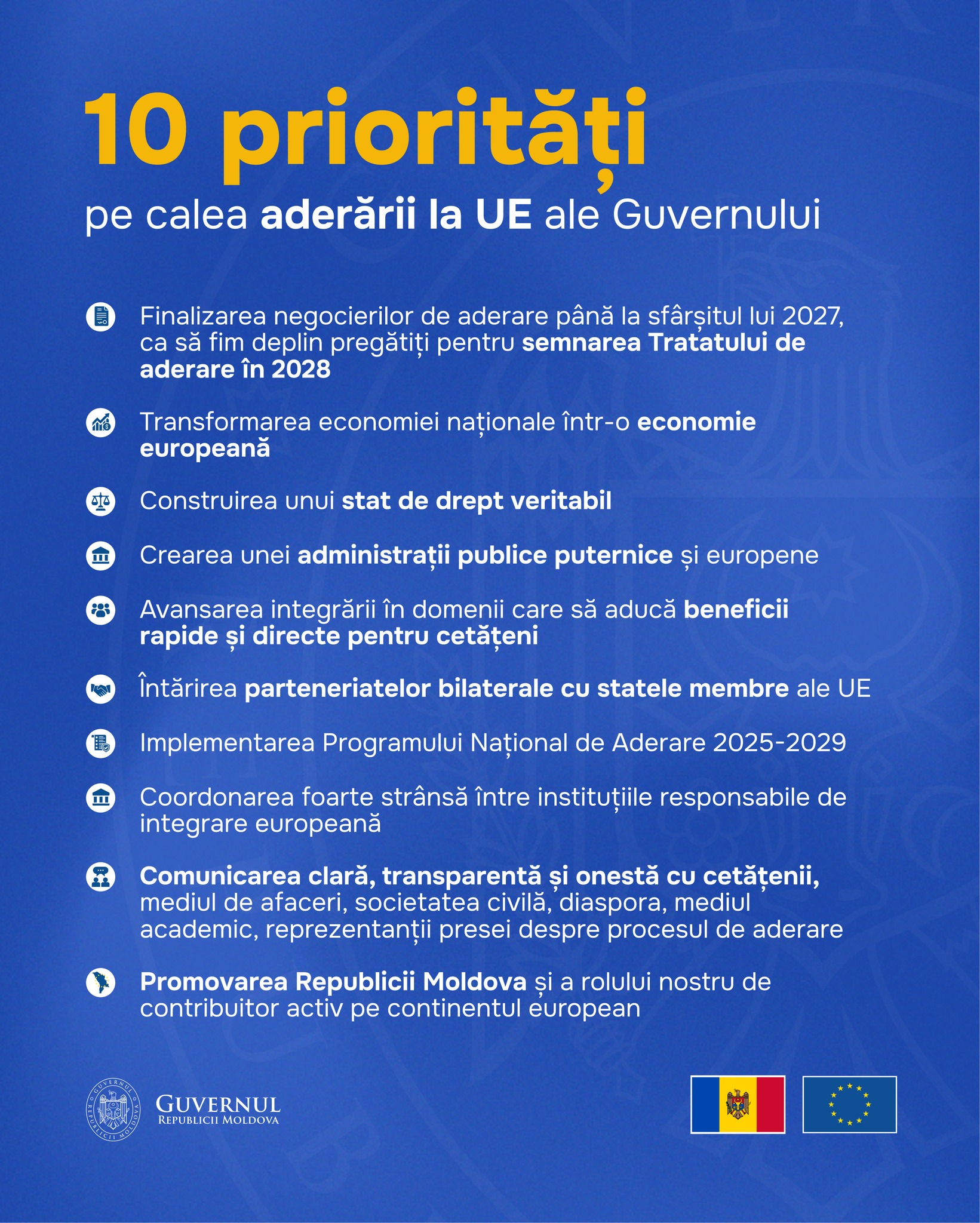 „Comunicarea clară, transparentă și onestă cu cetățenii, mediul de afaceri, societatea civilă, diaspora, mediul academic, reprezentanții presei despre procesul de aderare, dar și promovarea rolului R. Moldova de contribuitor activ pe continentul european”, sunt printre prioritățile trasate de către Guvernul Munteanu.