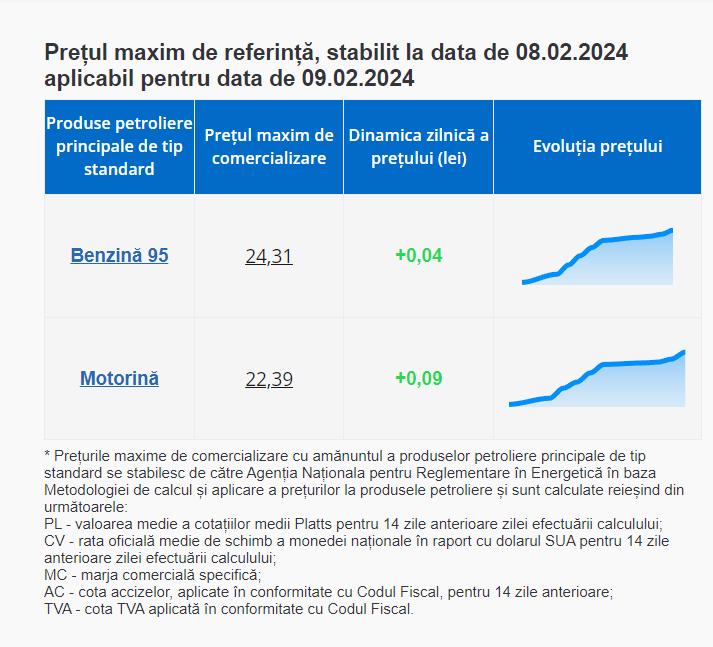 Agenţia Naţională pentru Reglementare în Energetică a stabilit preţuri noi la carburanţi pentru vineri, 9 februarie.