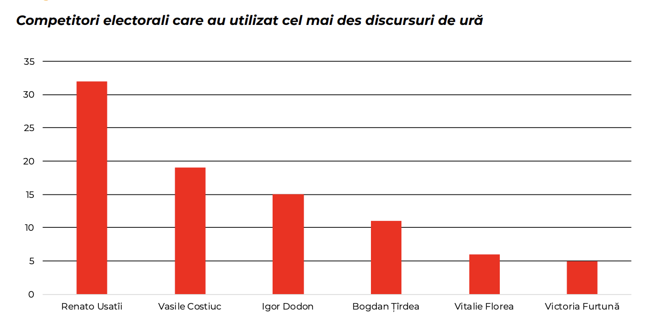 Dintre politicienii care au recurs discursuri de ură sau alte forme de manifestare a intoleranței, cele mai multe cazuri au fost susținute de Renato Usatîi, Vasile Costiuc, Igor Dodon, Bogdan Țîrdea, Vitalie Florea și Victoria Furtună, relevă studiul.