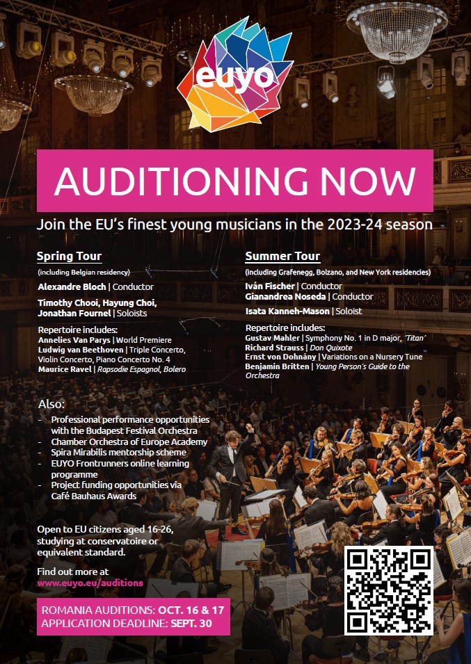 Până la 30 septembrie, tinerii muzicieni români cu vârste cuprinse între 16 și 26 de ani se pot înscrie la selecţia anuală pentru Orchestra de Tineret a Uniunii Europene (EUYO). Audițiile vor avea loc în zilele de 16 și 17 octombrie 2023, la București. Începând cu anul 2010, participarea muzicienilor români la EUYO este sprijinită de Institutul Cultural Român. Până în prezent, peste 20 de instrumentiști din România au luat parte la stagiile de formare EUYO, în cadrul parteneriatului cu ICR. Înscrierile se fac online, la https://euyo.eu/auditions/.