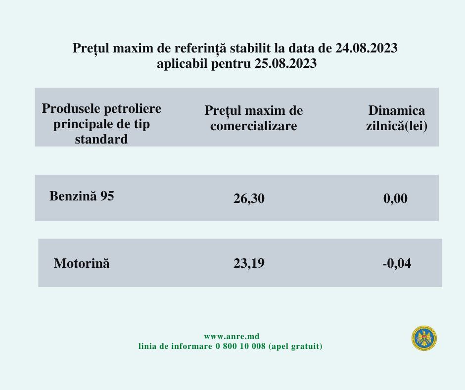 Pentru un litru de benzina, șoferii din R. Moldova vor scoate din buzunar 26 de lei și 30 bani, iar pentru un litru de motorină vor achita 23 de lei și 19 bani, cu 4 bani mai puțin.