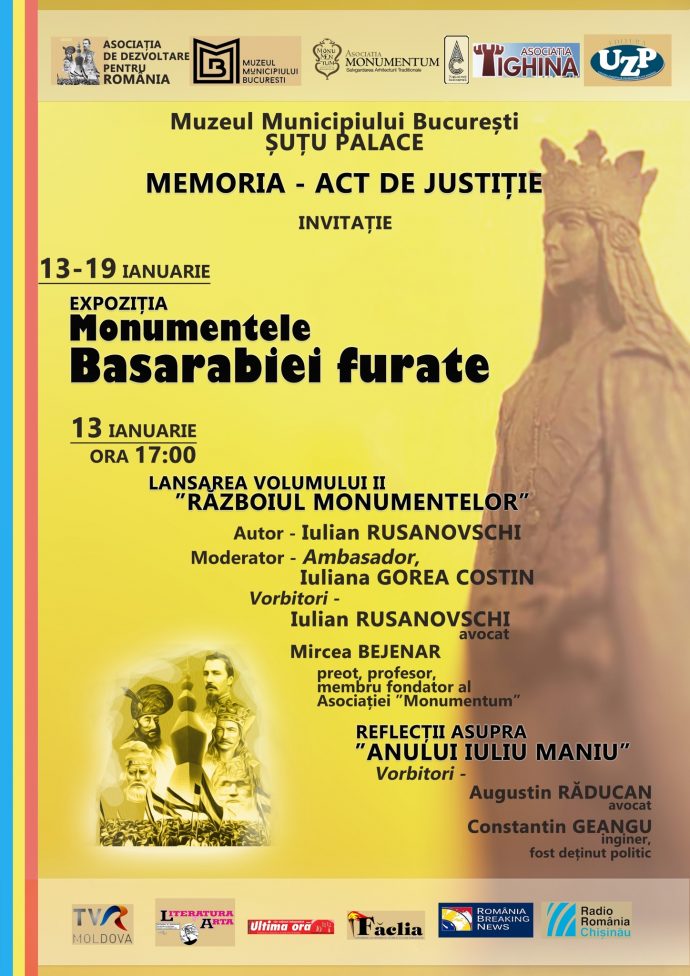 Asociaţia de dezvoltare pentru România, A.O. Monumentum, Fundația Iuliu Maniu și Ion Mihalache, Asociaţia Tighina, Alianță civică, Editura UZPR, Muzeul Municipiului București – „Șuțu Palace” organizează sub egida Acțiunea Memoria-act de justiție, Expoziția monumentelor Basarabiei furate și lansarea volumului „Războiul monumentelor”, autor Iulian Rusanovschi.