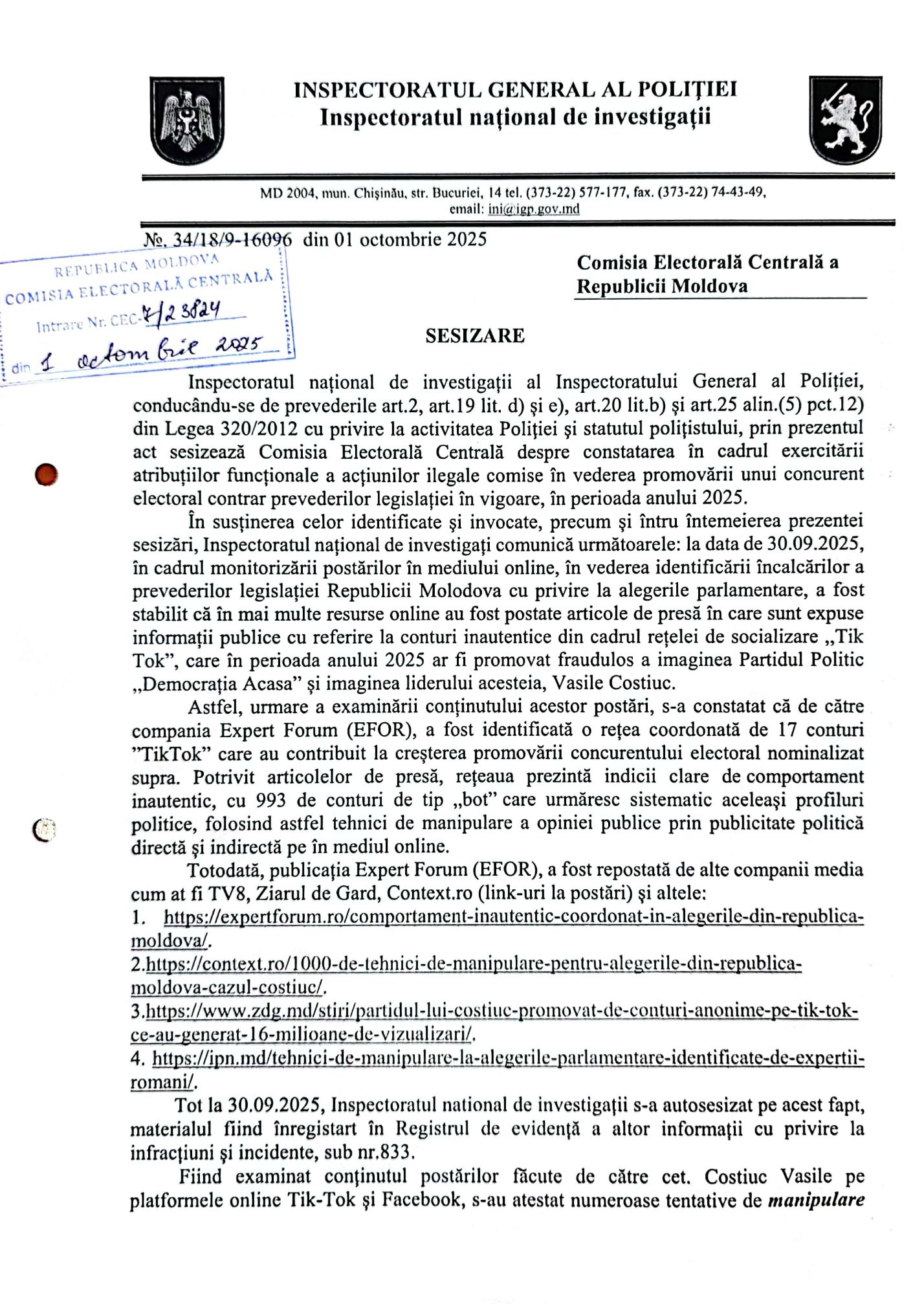 „Astfel, în urma examinării conținutului acestor postări, s-a constatat că Expert Forum (EFOR) a identificat o rețea coordonată de 17 conturi TikTok, ce au contribuit la creșterea promovării concurentului electoral. Potrivit articolelor de presă, rețeaua prezintă indicii clare de comportament inautentic, cu 993 de conturi de tip bot, care urmăresc sistematic aceleași profiluri politice, folosind astfel tehnici de manipulare a opiniei publice prin publicitate politică directă și indirectă în mediul online. Totodată, publicația Expert Forum (EFOR) a fost republicată de alte companii media cum ar fi TV8, Ziarul de Gardă, Context.ro (link-uri la postări) ș.a.”, se scrie în sesizarea INI.