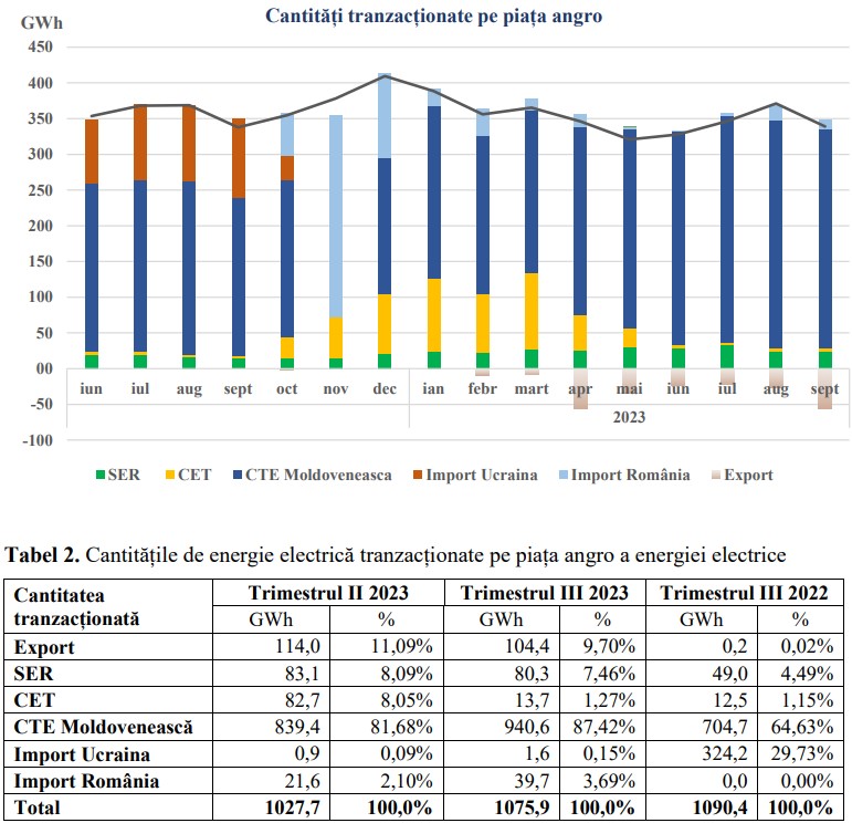 Datele ANRE mai arată în trimestrul III al anului 2023, sursa de bază în structura procurărilor de energie electrică din Republica Moldova a fost Centrala Termoelectrică Moldovenească de la Cuciurgan (Moldgres), cu o pondere de 87,4% din toată cantitatea.