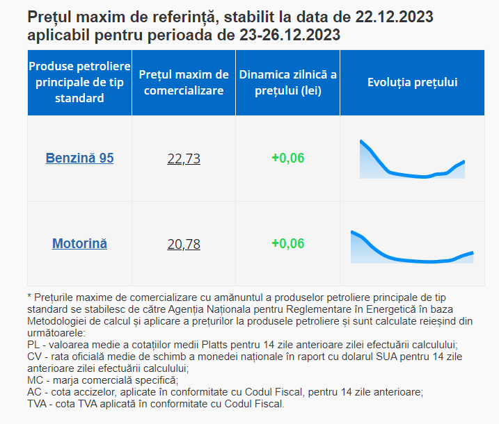 Astfel, prețul unui litru de benzină A95 nu trebuie să depășească 22,73 lei, iar cel pentru un litru de motorină - 20,78 lei.