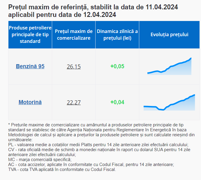 Agenţia Naţională pentru Reglementare în Energetică a stabilit preţuri noi la carburanţi pentru vineri, 12 aprilie.