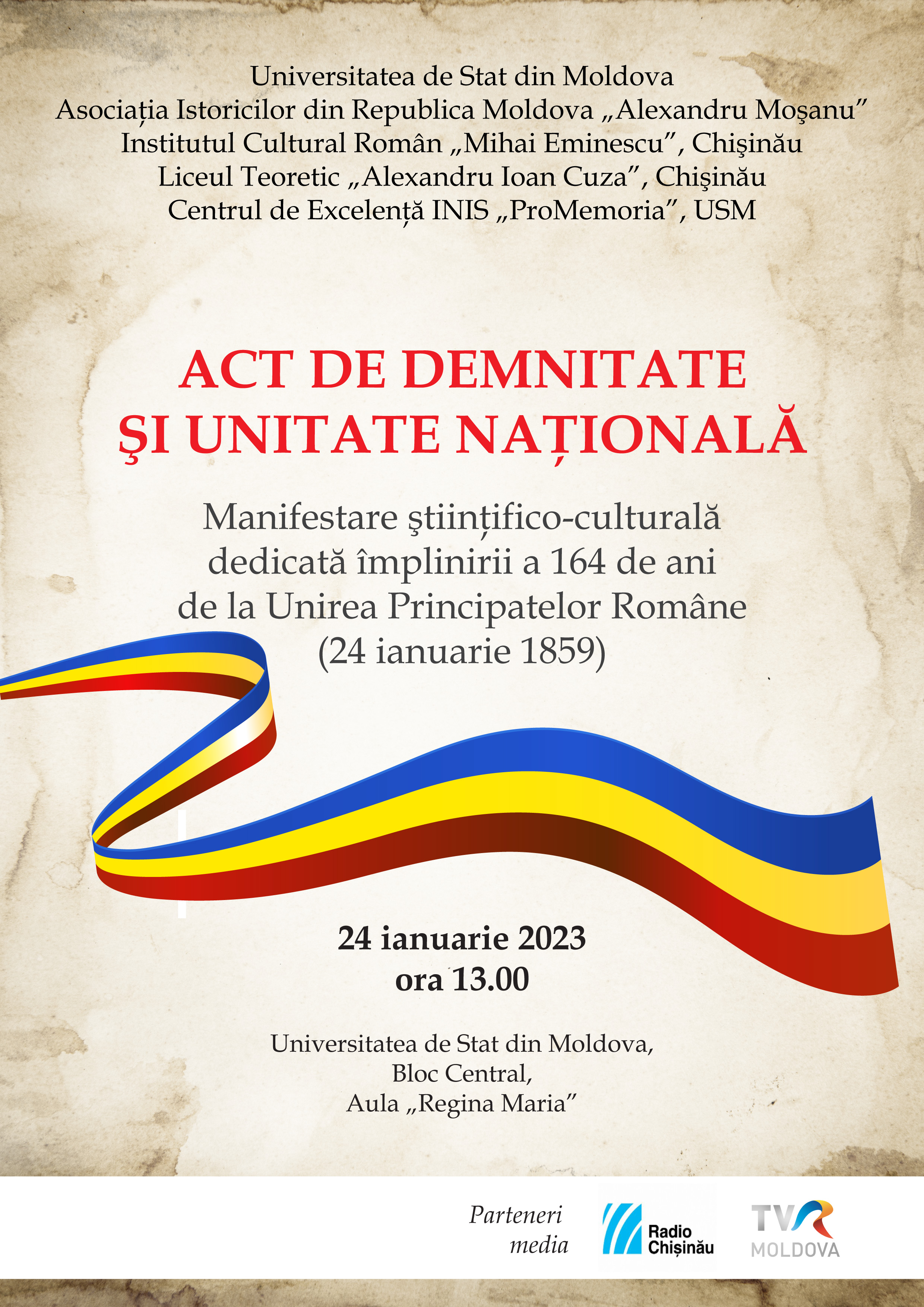 Institutul Cultural Român „Mihai Eminescu” la Chișinău în colaborare cu Universitatea de Stat a Moldovei - Facultatea de Istorie și Filosofie, Asociația Istoricilor din Republica Moldova „Alexandru Moșanu”, Centrul de Excelență INIS „ProMemoria”, USM; Liceul Teoretic „Alexandru Ioan Cuza” din Chișinău; Universitatea „Alexandru Ioan Cuza” din Iaşi - Facultatea de Istorie, organizează o manifestare cultural-științifică dedicată celor 164 de ani de la Unirea Principatelor Române - Moldova și Țara Românească.