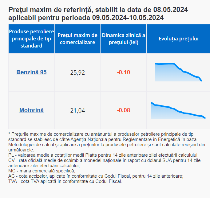 Agenţia Naţională pentru Reglementare în Energetică a stabilit preţuri noi la carburanţi pentru perioada 9 - 10 mai.