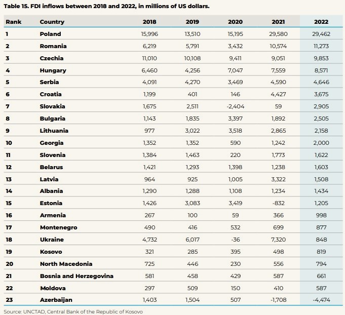 Lideră la atragerea ISD este Polonia cu circa 29,5 miliarde de dolari, urmată la mare distanță de România – cu un volum de 11,3 miliarde, Cehia – cu 9,85 miliarde de dolari, Ungaria – cu 8,6 miliarde și Serbia – cu 4,6 miliarde de dolari.