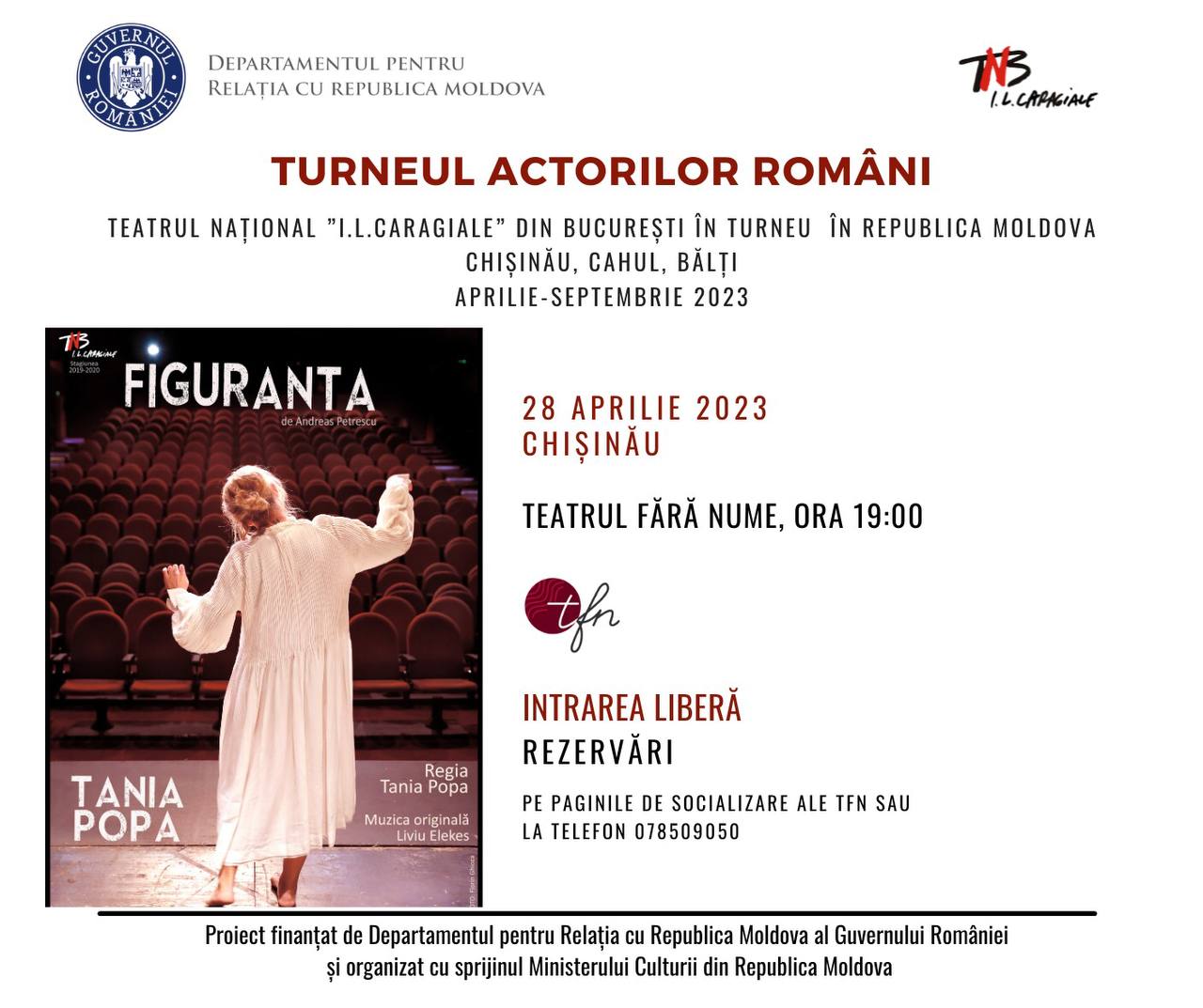 Spectacolul „Figuranta” de la Teatrul Național Ion Luca Caragiale din București va fi jucat în acestă seară pe scena Teatrului Fără Nume, la 19:00. Spectacolul este suţinut de Departamentul pentru Relaţia cu Republica Moldova, iar intrarea este liberă.