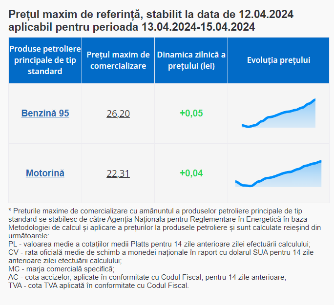 Agenţia Naţională pentru Reglementare în Energetică a stabilit preţuri noi la carburanţi pentru perioada 13.04.2024-15.04.2024.