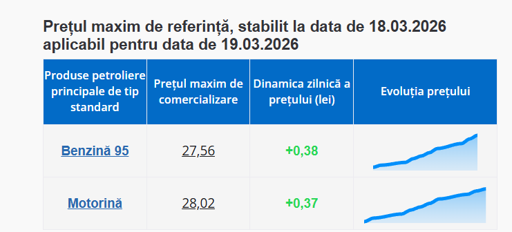 Potrivit ANRE, motorina va înregistra o majorare de 0,37 de bani, stabilindu-se la 28,02 lei pentru un litru, iar benzina va crește cu 0,38 de bani, ajungând la 27,56 lei pentru un litru.