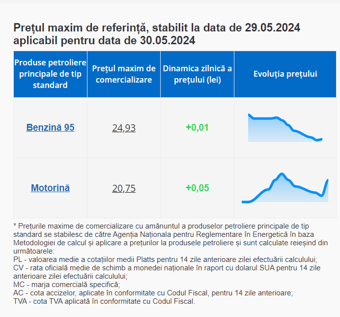 Benzina va fi mai scumpă cu un ban decât astăzi, urmând a fi comercializată cu prețul de 24,93 lei/litru.Motorina va fi mai scumpă cu 5 bani și va costa la pompe maximum 20,75 lei/litru.