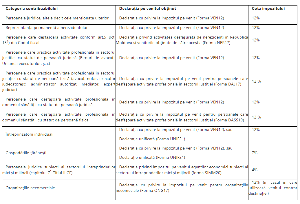 Persoanele juridice rezidente, inclusiv cele specificate la art.512 şi 513 , cu excepţia autorităţilor publice şi instituţiilor publice, formele organizatorice rezidenţi cu statut de persoană fizică, persoanele care desfășoară activități profesionale, reprezentanța permanentă a nerezidentului în Republica Moldova, sunt obligate să prezinte declarația cu privire la impozitul pe venit indiferent de prezenţa obligaţiei privind achitarea impozitului.