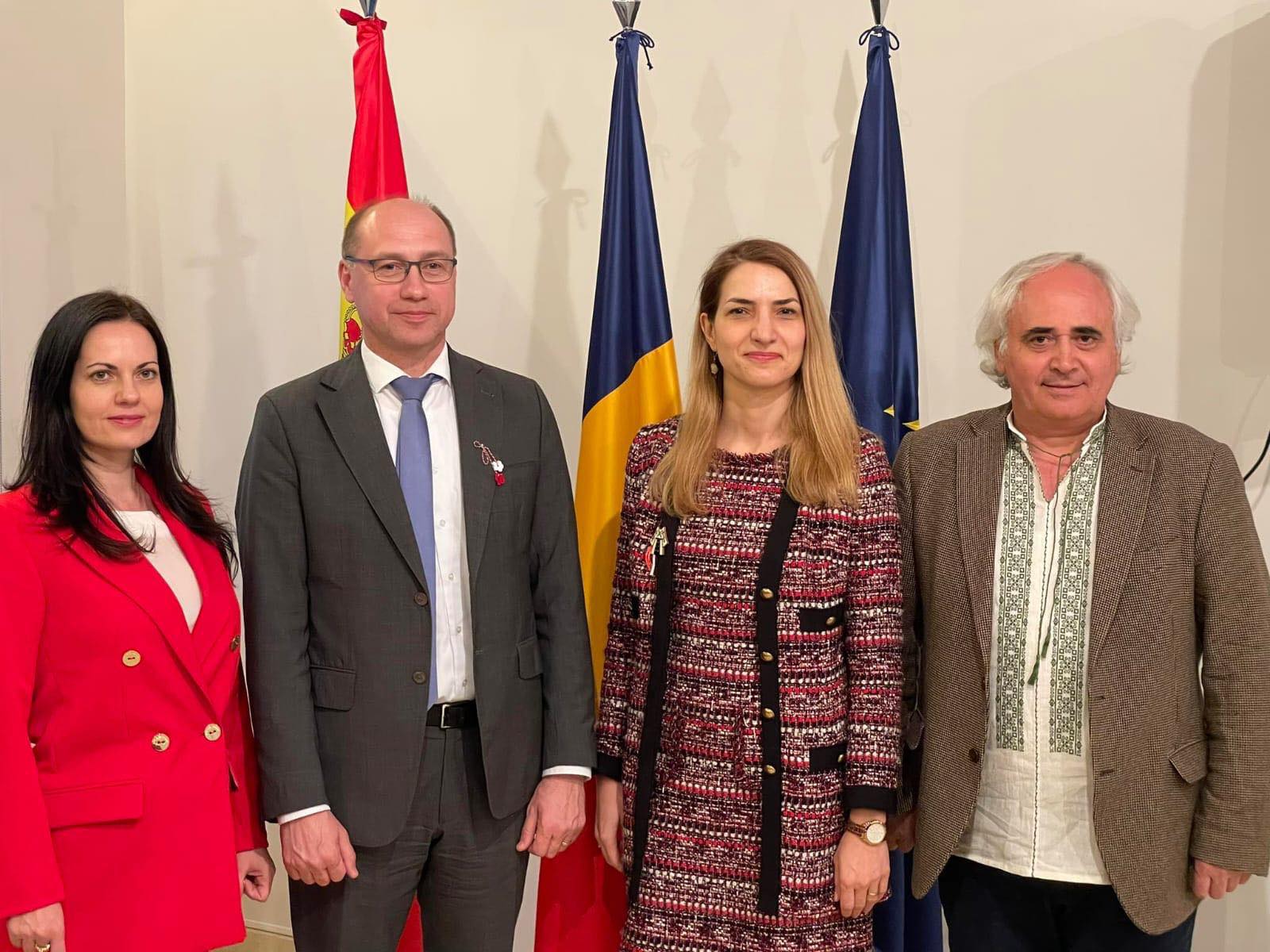 În a doua jumătate a zilei, am trecut Prutul la Ambasada României în Spania / Embajada de Rumanía en España , la invitația doamnei Raluca Mihailă, Ambasadoare Interimară și a doamnei Maria-Ioana Pop, directoare Instituto Cultural Rumano Madrid/Institutul Cultural Român de la Madrid. Am fost salutați de Laviniu Enii, ministru consilier, și de membrii misiunii diplomatice. Aici am avut ocazia să ne întâlnim din nou cu oameni din comunitatea care vorbește limba română, să punem în discuție experiențele trecutului nostru, să vorbim despre șansele la cultură pe care ni le oferă uneori destinul și despre faptul cât de important este să nu le ratăm.