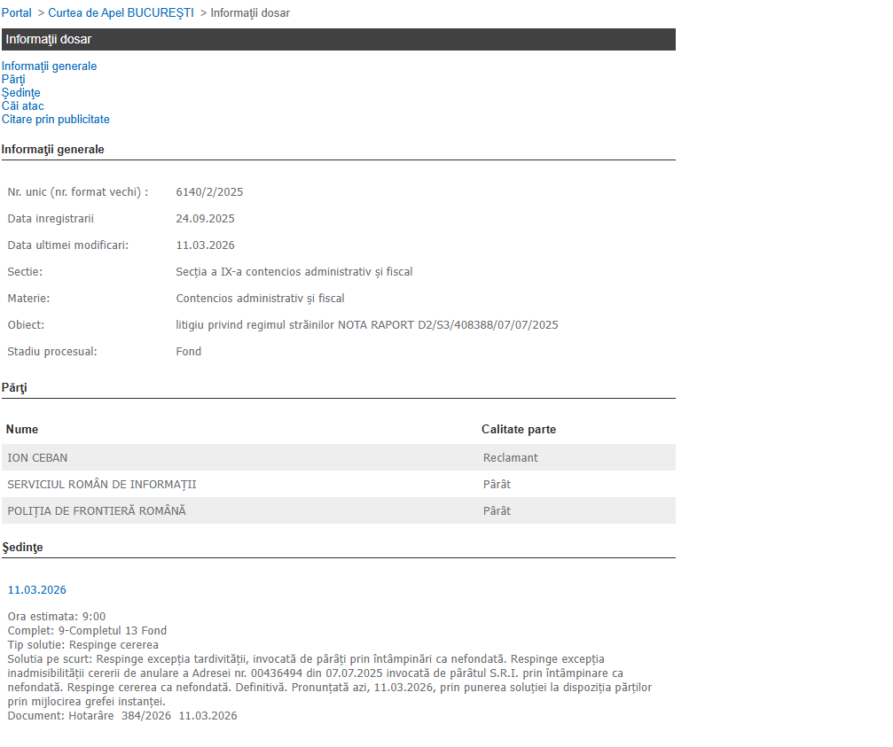 Ion Ceban a pierdut deja un proces care avea ca obiect suspendarea executării interdicției de a intra în România, iar pe 11 martie 2026 așteaptă pronunțarea în litigiul privind regimul străinilor, în care urmărește anularea măsurii. La termenul de judecată din 2 decembrie 2025, instanța a amânat procesul lui Ion Ceban pentru ca avocații acestuia să citească documentele secrete depuse de SRI și pentru ca instanța să găsească un grefier cu cerificare a Oficiului Registrului Național al Informațiilor Secrete de Stat (ORNISS), instituția din România responsabilă de gestionarea și protecția informațiilor clasificate.