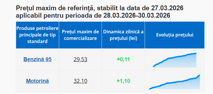 Potrivit ANRE, motorina înregistrează o majorare cu 1,10 lei, stabilindu-se la 32,10 lei pentru un litru, iar benzina va crește cu 11 de bani, ajungând la 29,53 lei pentru un litru.