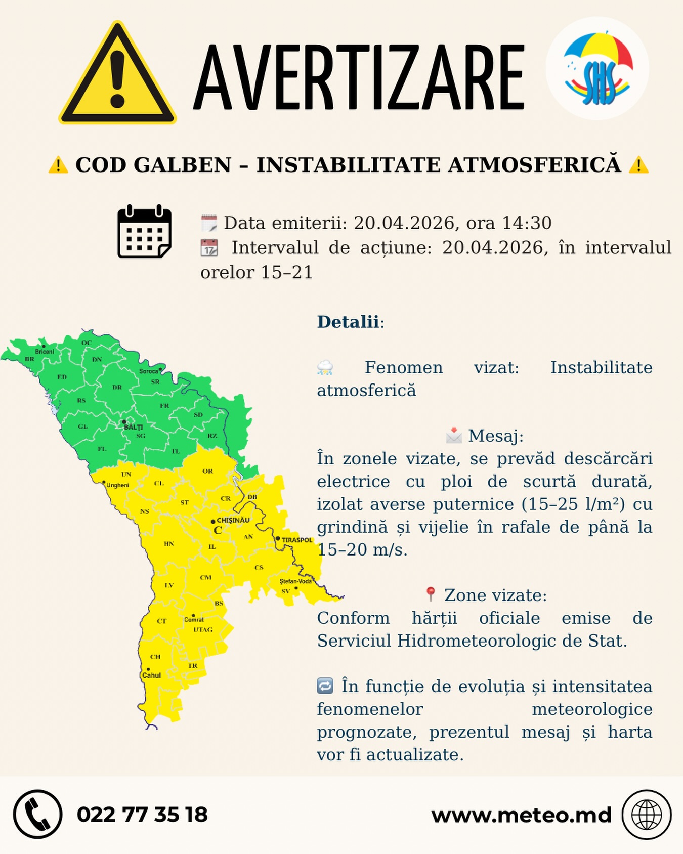 Serviciul Hidrometeorologic de Stat a emis o avertizare de instabilitate atmosferică valabilă pentru data de 20 aprilie 2026, în intervalul orelor 15:00–21:00.