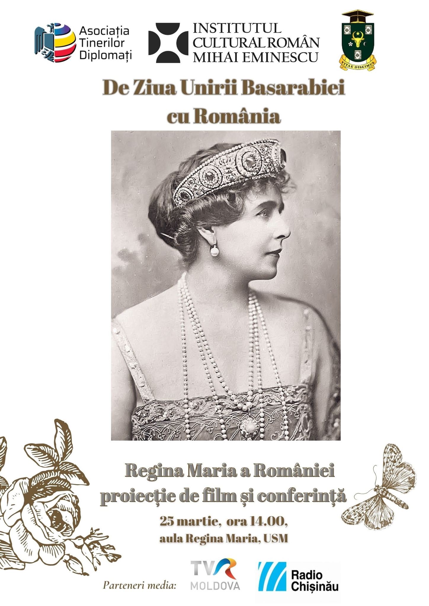 ICR Chișinău în colaborare cu Universitatea de Stat din Moldova și Asociația Tinerilor Diplomați din Moldova organizează, pe data de 25 martie 2024, ora 14.00, pentru a marca Unirea Basarabiei cu România, o conferință urmată de proiecția documentarului Maria - inima României (2018, regia Trevor Poots).