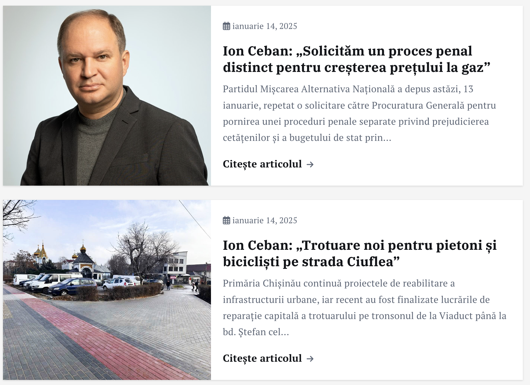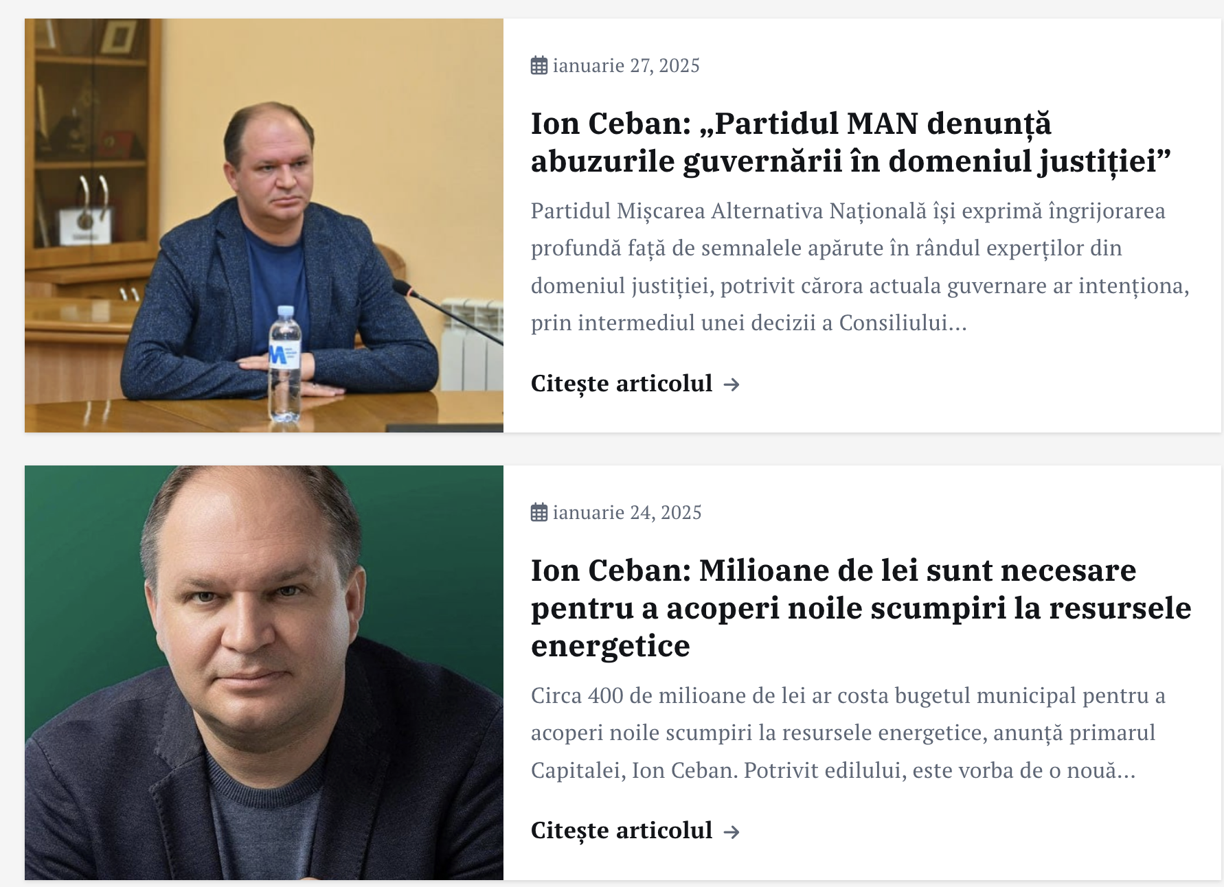 Un grup de persoane asociate cu fostul candidat la prezidențialele din România, Călin Georgescu, cunoscută ca rețeaua Hanț–Iană, prin intermediul a două vehicule media - jurnalulmoldovenesc.eu și jurnalulromanesc.eu - l-au promovat sistematic pe primarul pro-rus al Chișinăului, Ion Ceban — declarat indezirabil în România pentru cinci ani, pe motive de siguranță națională, se arată într-o investigație semnată de Investigative Report.