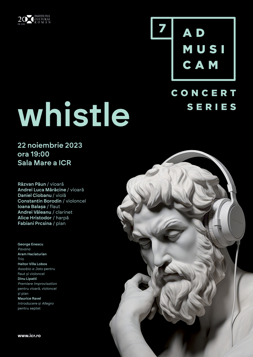 Programul AdMusicam Concert Series continuă cu #Whistle, eveniment care va avea loc miercuri, 22 noiembrie 2023, ora 19.00, la Sala Mare a Institutului Cultural Român. Concertul va fi susținut de Ioana Balașa (flaut), Constantin Borodin (violoncel), Răzvan Păun (vioară), Andrei Luca Mărăcine (vioară), Andrei Văleanu (clarinet), Alice Hristodor (harpă) și Fabiani Prcsina (pian) și Daniel Ciobanu (violă).