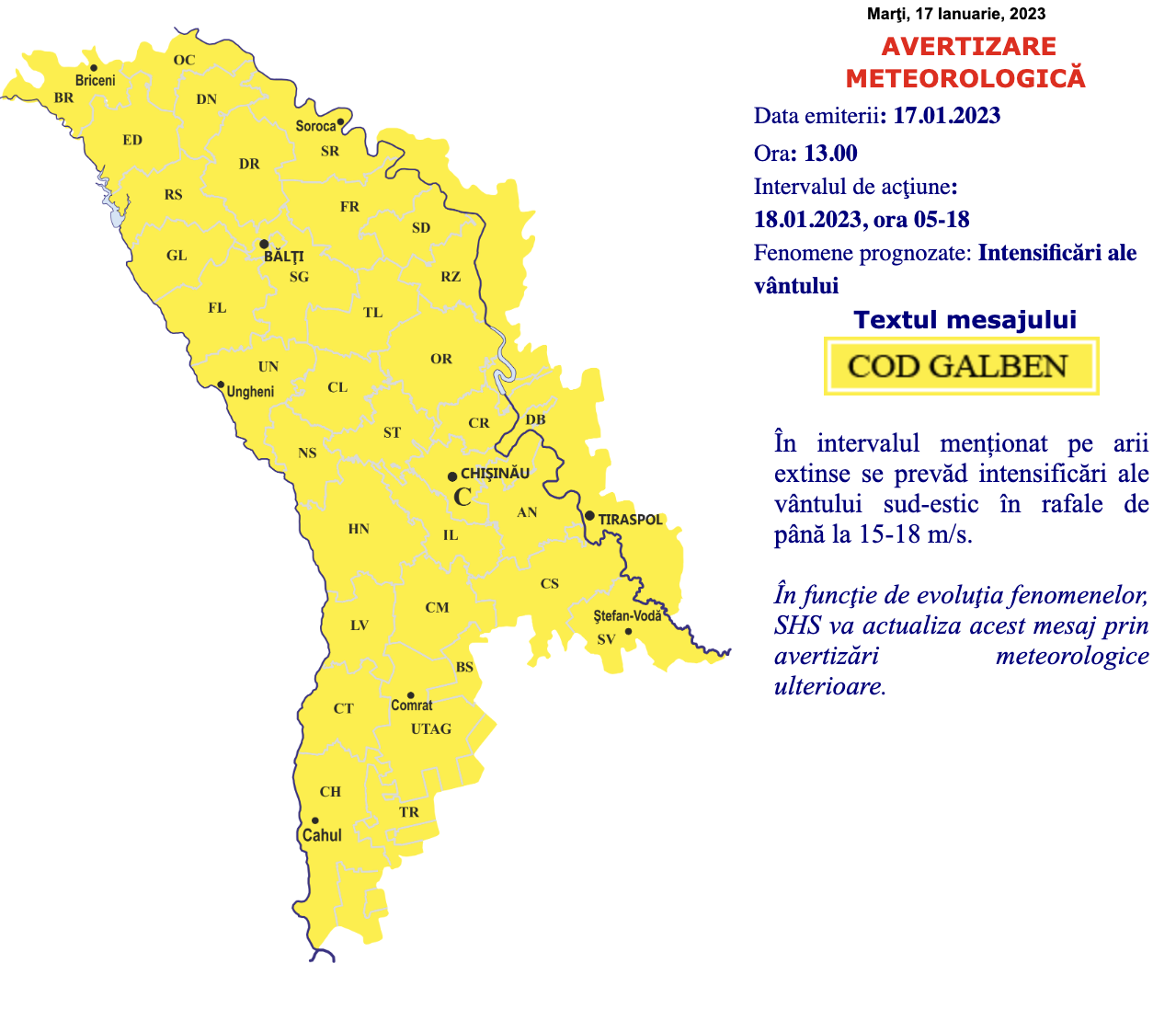 Serviciul Hidrometeorologic de Stat (SHS) a emis cod galben de intensificări ale vântului, valabil pe întreg teritoriul Republicii Moldova. Avertizarea meteo intră în vigoare mâine, 18 ianuarie, în intervalul orelor 05-18.