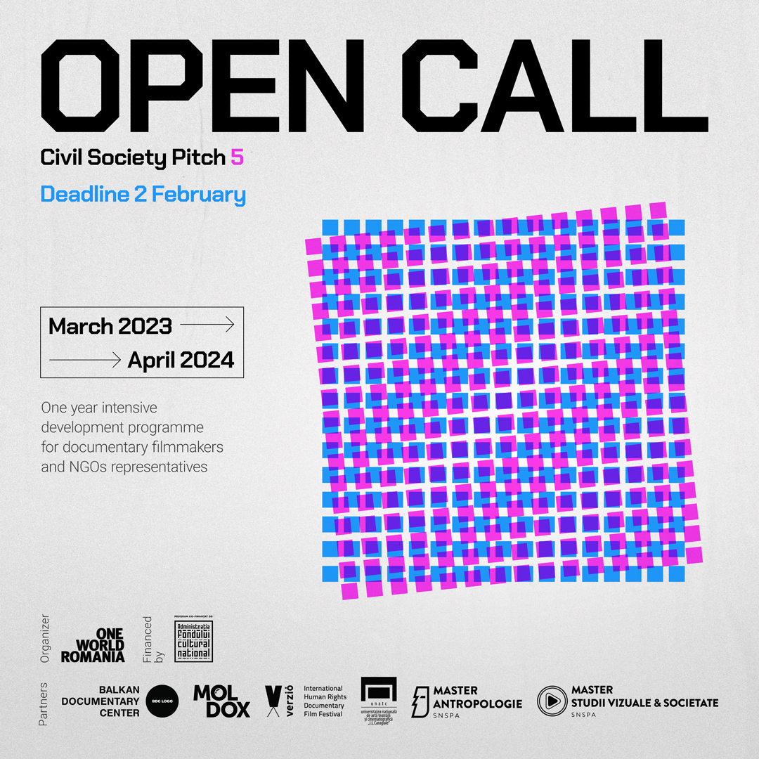 CIVIL SOCIETY PITCH powered by ONE WORLD ROMANIA revine cu a 5-a ediție a programului unic de dezvoltare de documentar cu focus pe teme sociale și drepturile omului. Această ediție va cuprinde ateliere, seminarii și mentorat cu specialiști internaționali pe durata unui an și se va desfășura în perioada martie 2023 – aprilie 2024, la București.