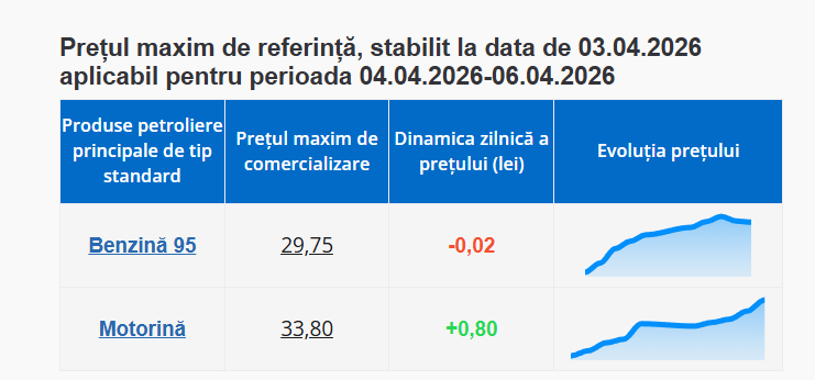 Potrivit ANRE, motorina înregistrează o majorare cu 80 de bani, stabilindu-se la 33,80 de lei pentru un litru, iar prețul benzinei va scădea cu 2 de bani, ajungând la 29,75 lei pentru un litru.