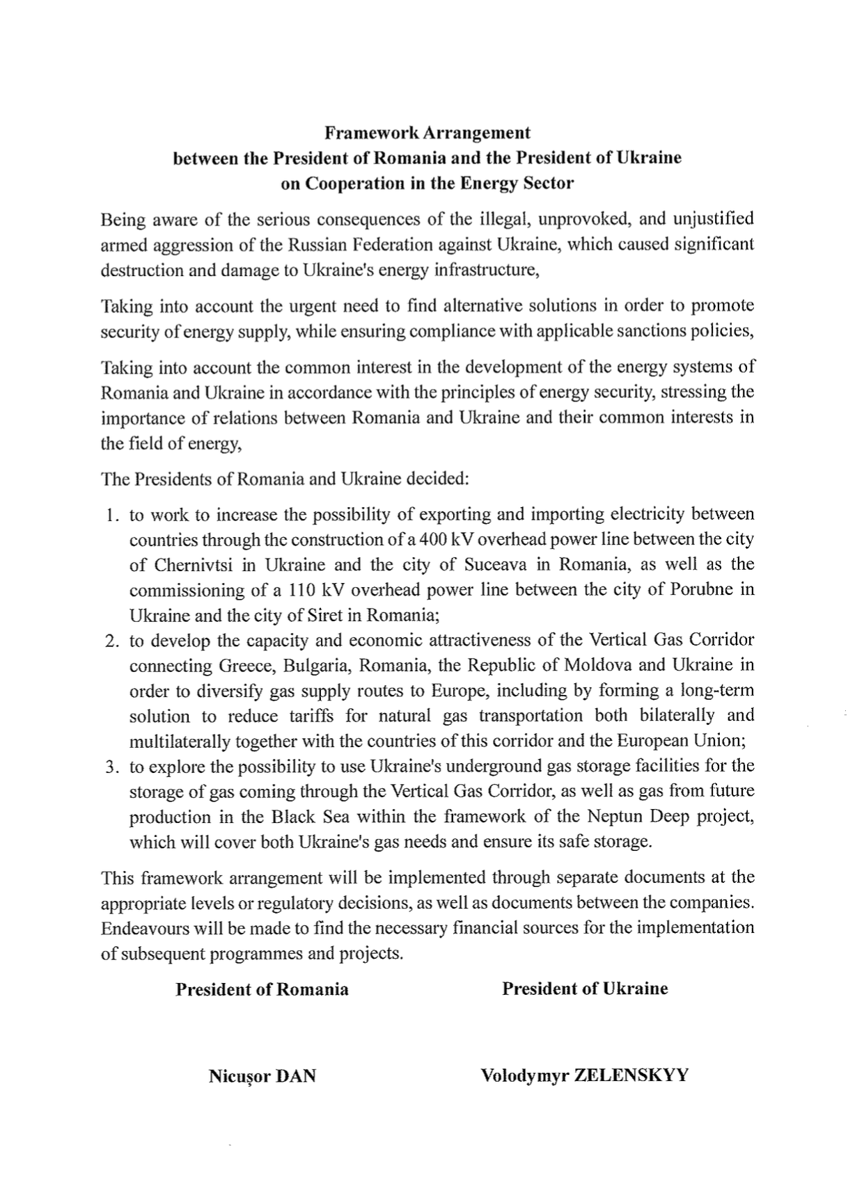 De asemenea, cele două state se angajează să exploreze posibilitatea utilizării facilităților subterane de stocare a gazelor din Ucraina pentru depozitarea gazului transportat prin Coridorul Vertical de Gaze, precum și a gazului provenit din viitoarea producție din Marea Neagră, în cadrul proiectului Neptun Deep.