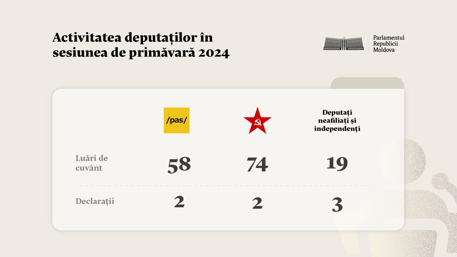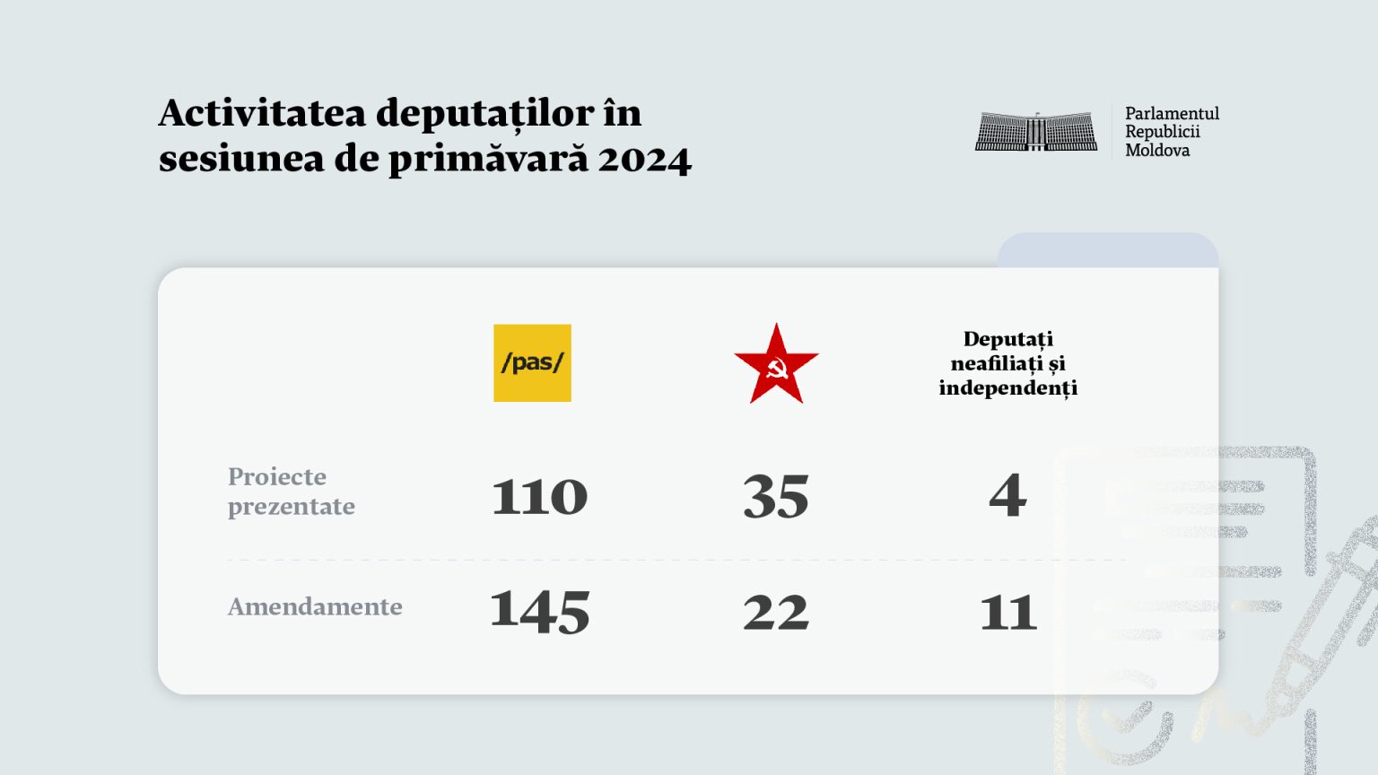 166 de inițiative legislative au fost prezentate de către deputați pe parcursul sesiunii de primăvară 2024. De asemenea, parlamentarii au înaintat 178 de amendamente, au susținut 151 de luări de cuvânt și șapte declarații.