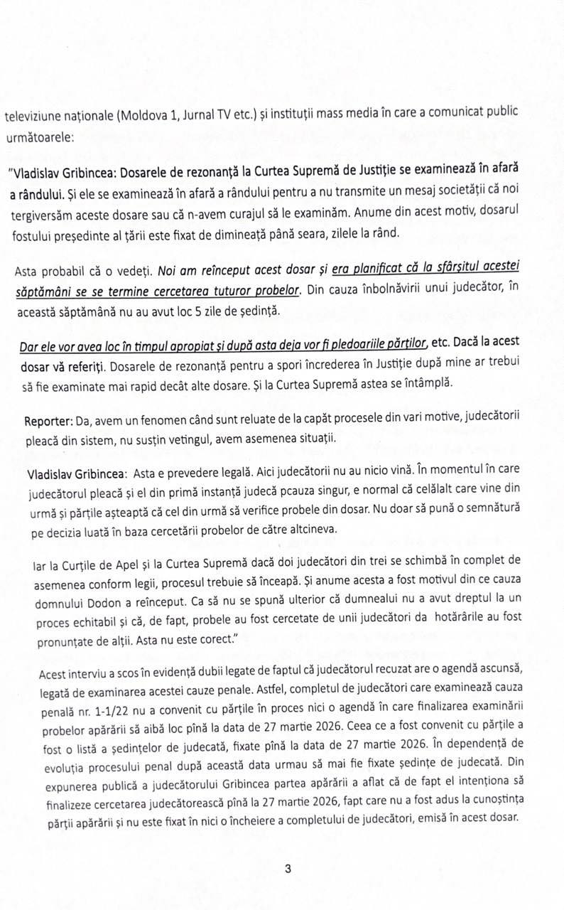 Motivul principal este o declarație publică a lui Gribincea, potrivit căreia cercetarea tuturor probelor în dosarul „Kuliok” urma să fie finalizată până pe 27 martie 2026. Avocații lui Dodon susțin că această declarație „scoate în evidență dubii privind agenda ascunsă a judecătorului” și afectează dreptul la un proces echitabil.