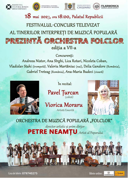 Institutul Cultural Român „Mihai Eminescu” la Chișinău sprijină organizarea celei de-a șaptea ediții a Festivalului – Concurs Televizat Pentru Tinerii Interpreţi de Muzică Populară „Prezintă Orchestra FOLCLOR”, eveniment organizat de Filarmonica Națională „Serghei Lunchevici” și Compania Publică TeleRadio Moldova, în colaborare cu Primăria Municipiului Chișinău.