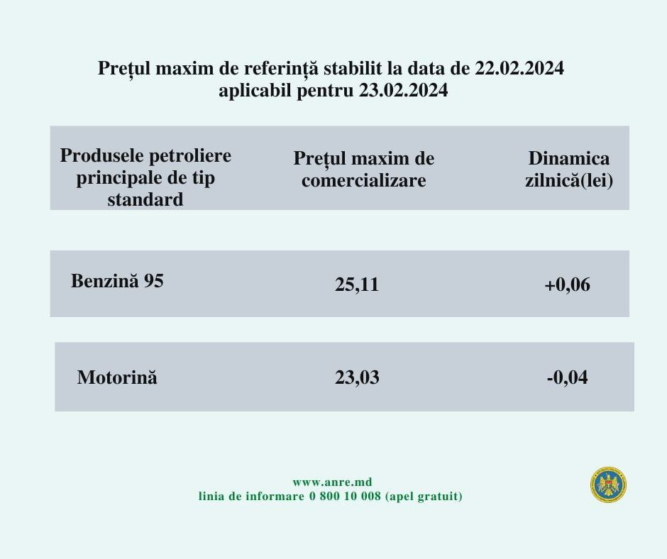 Agenția Națională pentru Reglementare în Energetică a dat publicității prețurile plafon la benzină și motorină, valabile pentru mâine, 23 februarie.
