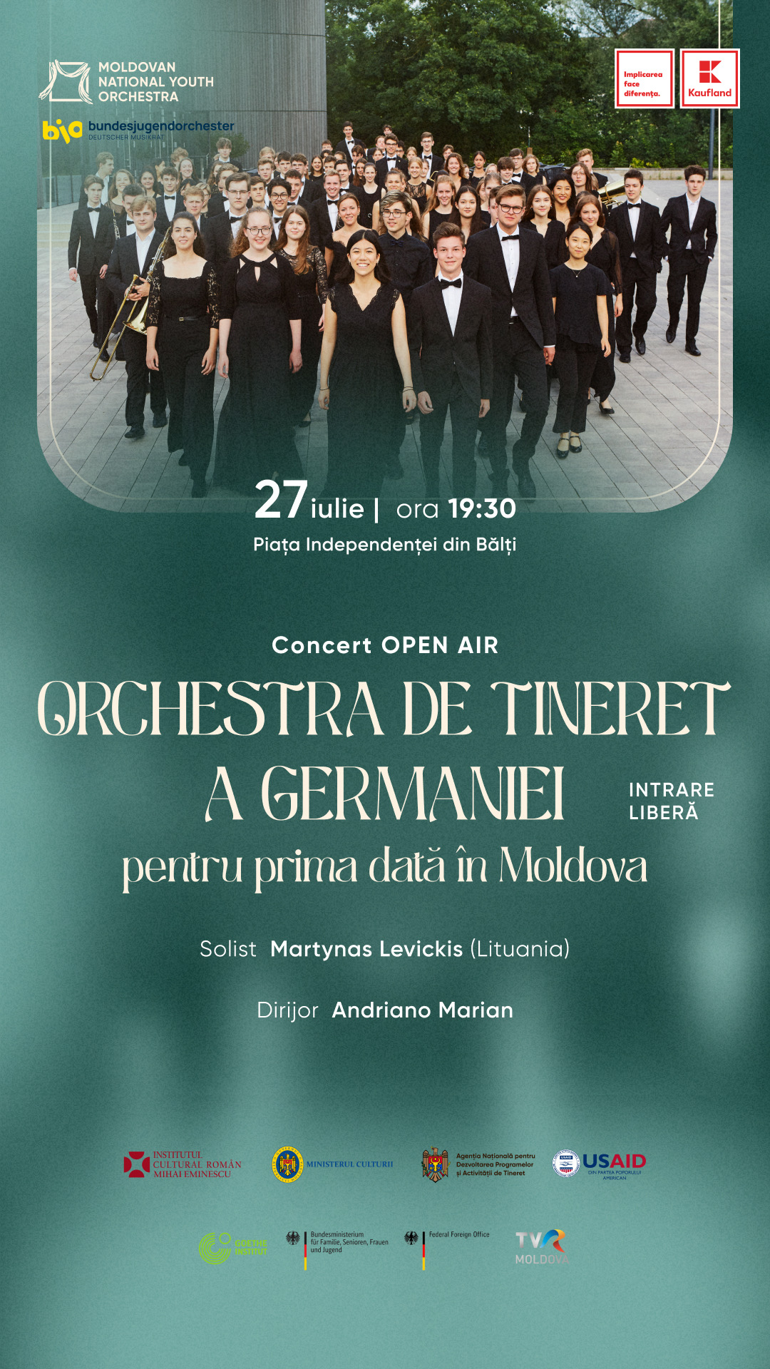 Institutul Cultural Român „Mihai Eminescu” la Chișinău invită melomanii din Bălți și Chișinău la două concerte de zile mari susținute de Orchestra de Tineret a Germaniei în colaborare cu Moldovan National Youth Orchestra. Șaisprezece muzicieni din ambele orchestre, împreună cu acordeonistul invitat Martynas Levickis și dirijorul Andriano Marian, vor interpreta lucrări de Piazzolla, Jenkins, Bach, Vivaldi, Franck, Faure, Pîslari și altele.